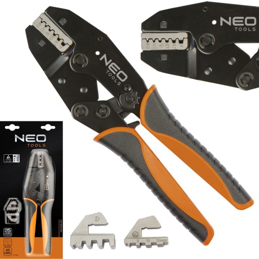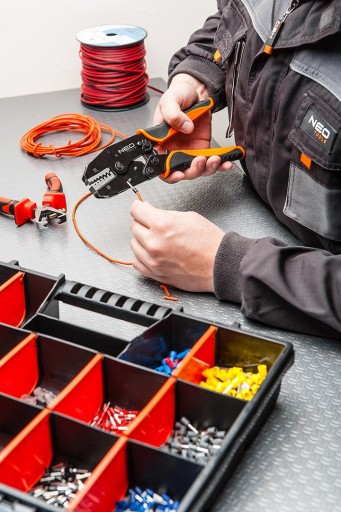 Szczypce do zaciskania końcówek tulejkowych NEO (nr ref. 01-506) o długości 220 mm. Z wymiennymi głowicami do zaciskania końcówek nieizolowanych. Głowice wykonane z wytrzymałej stali chromowo-molibdenowej o twardości 45 HRC. Dwumateriałowy, ergonomiczny uchwyt podnosi komfort pracy. Jakość narzędzia potwierdzona certyfikatem TÜV i 25-letnią gwarancją producenta. Marka NEO spełnia oczekiwania profesjonalistów.
