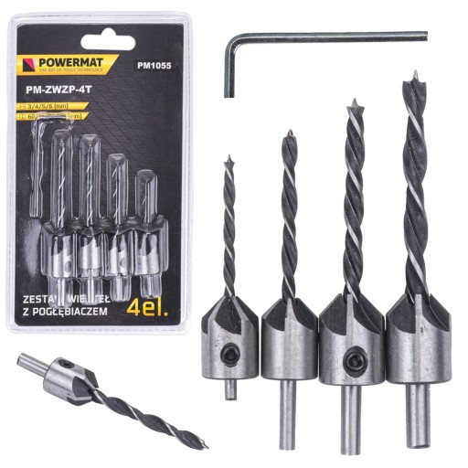 - 4 wiertła z pogłębiaczami