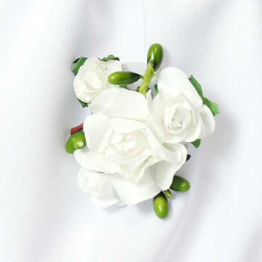 WIANEK upleciony jest z drobnych różyczek w kolorze ecru z dodatkiem zielonego, na drucie. Z tyłu wianka różyczki tworzą aż trzy gęste rzędy. pod nimi upięte są tasiemki satynowe, które spadają wzdłuż włosów. Wianek wykonany jest z tworzyw papierniczych z dodatkiem drutu.