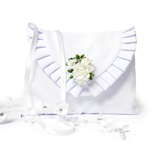 TOREBKA typu kopertówka z ozdobnym marszczeniem oraz przypinką kwiatową. Torebka na tasiemce satynowej, na ramię. Do torebki swobodnie zmieści się książeczka do modlitwy, różaniec, chusteczki.