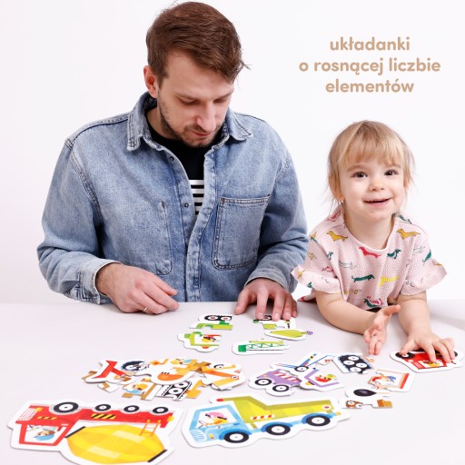Czas kontynuować przygodę z puzzlami i rozwijać umiejętności! Każda układanka składa się z puzzli o rosnącej liczbie elementów: 2, 3, 4, 5 i 6. W rozdzieleniu elementów pomogą wam różne kolory rewersów na układankach. Zacznijcie zabawę od 2-elementowych układanek, stopniowo przechodząc do coraz trudniejszych. W razie potrzeby pomóż dziecku w układaniu. Nazywajcie pojazdy. Naśladujcie ich odgłosy i opowiadajcie historyjki inspirowane ilustracjami.