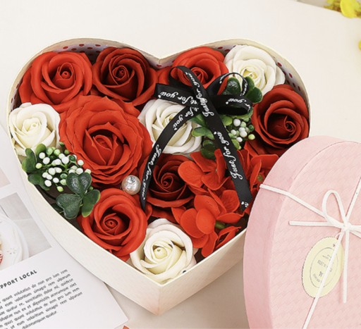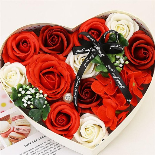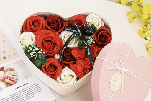 To ozdobne pudełko zawiera pięknie wykonane kwiaty z mydła, które wyglądają jak prawdziwe, ale można je używać do kąpieli lub dekoracji.