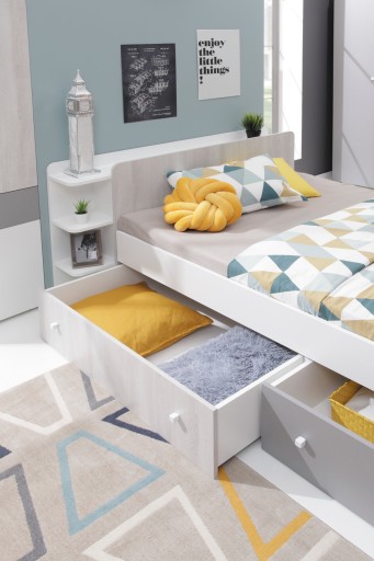 Łóżko jest nieodłącznym elementem naszego życia, dlatego też należy zwrócić szczególną uwagę przed zakupem odpowiedniego dla zdrowego snu dziecka, a dodatkowo komfortowego miejsca sprzyjającemu przyswajaniu i poszerzaniu wiedzy. Łóżko Como to idealny mebel, który wypełni wnętrze pokoju młodzieżowego czy też dziecięcego. Przytulne i w stonowanych, nowoczesnych barwach sprawdzi się w każdym wnętrzu. Na boku posiada szuflady, które mogą posłużyć jako pojemniki na pościel lub schowki na rzeczy osobiste. Solidnie wykonane z wysokojakościowych materiałów zapewnia wygodę i bezpieczeństwo, a do tego posłuży przez lata.