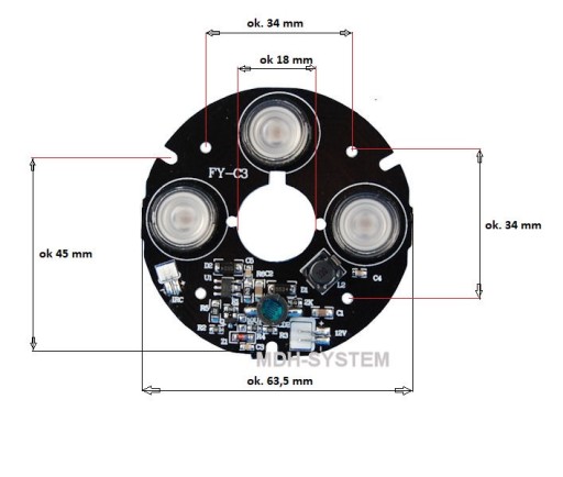 OŚWIETLACZ IR PODCZERWIENI 850 nm 20 m REFLEKTOR PODCZERWIENI 63 mm 3 DIODY MODUŁ FY-C3
