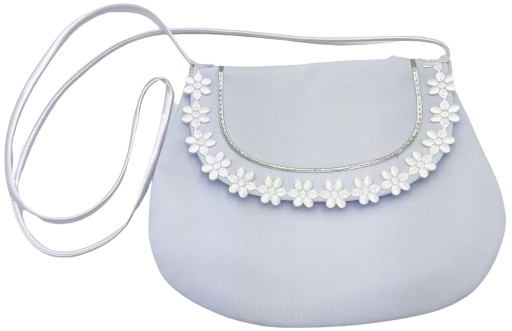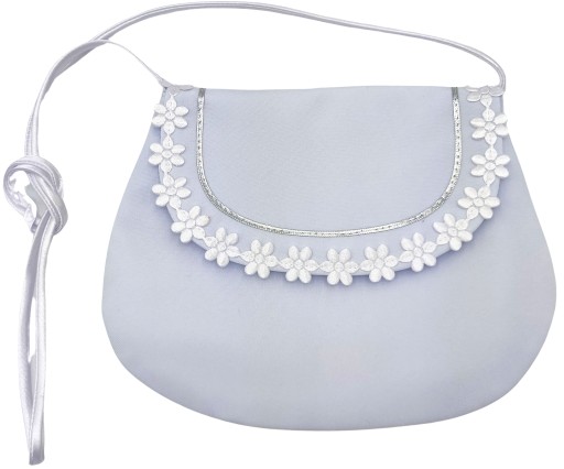 Torebka stanowi efektowny dodatek do ubioru komunijnego. Torebeczka jest uszyta na podszewce i usztywniona, przez co zachowuje swój naturalny kształt. Uroku dodaje zapinana na praktyczny rzep patka ozdobiona srebrną taśmą liturgiczną i białymi kwiatkami.