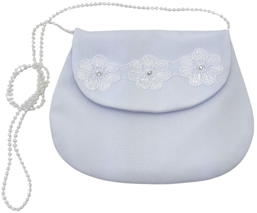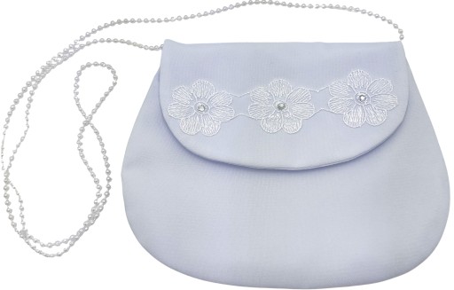 Torebka stanowi efektowny dodatek do ubioru komunijnego. Została uszyta na podszewce i usztywniona, przez co zachowuje swój naturalny kształt. Uroku dodaje zapinana na praktyczny rzep patka ozdobiona koronkowymi kwiatkami i kryształkami.