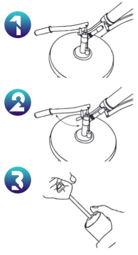 3- Dopiero wtedy zerwać zamknięcie wyciągane („Pull-off“) kartusza i nakręcić głowicę smarownicy.