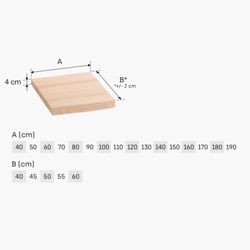 Solidny blat drewniany. Blat o wymiarach 40 x 40 cm (powierzchnia użytkowa) wykonany z litego drewna charakteryzuje się unikalną, nieregularną krawędzią. Doskonale sprawdzi się jako blat pod umywalkę.