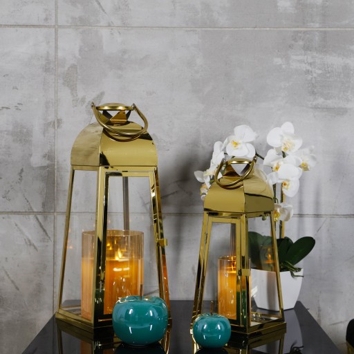Przedmiotem sprzedaży jest komplet dwóch latarni metalowych, wykonanych w całości z złotej stali chromowanej i szkła.