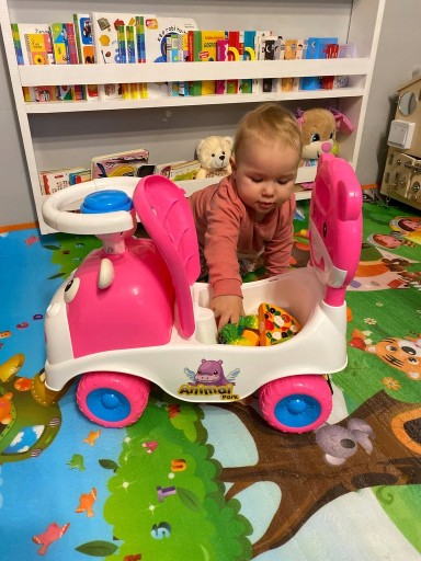 Jeździk hipcio z uśmiechniętą buźką o słodkim wyglądzie zapewniający ogromną frajdę dla dziecka. Wyposażony jest w schowek pod siedzeniem, klakson w kierownicy oraz wygodne siedzenie z wyjmowanym oparciem.