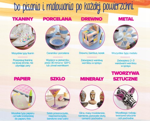 Tusz pigmentowy na bazie wody kryje, jest nieprzejrzysty i matowy, jest również bezwonny, szybko wysycha i nie wnika. Marker POSCA idealnie nadaje się również do malowania, ponieważ można go stosować do suchego pokrycia bez ściekania. Kolorowe markery POSCA nadają się do prawie wszystkich powierzchni. Kolor jest trwały na powierzchniach takich jak papier, karton, drewno, glina, metal, tekstylia, ceramika, porcelana i plastik i można go zetrzeć z gładkich powierzchni, takich jak szkło.