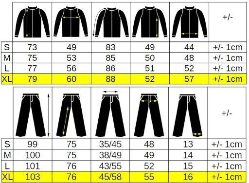 - Szerokość spodni w pasie podana jest w dwóch wartościach (np. 35/45): pierwsza wartość to szerokość spodni luzem, a druga to szerokość spodni po maksymalnym rozciągnięciu ściągacza znajdującego się w pasie.