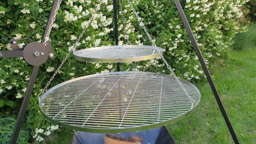 Wysokiej jakości nierdzewny ruszt okrągły do zawieszania nad paleniskiem o średnicy 90 cm.
