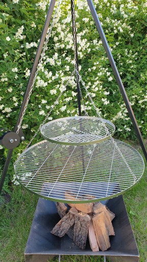Wysokiej jakości nierdzewny ruszt okrągły do zawieszania nad paleniskiem o średnicy 90 cm.