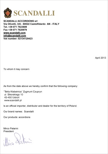 Po kilku latach, w 2013 roku, jako zadowolony klient i użytkownik tego cudownego instrumentu, zawiązałem współpracę z firmą Scandalli.