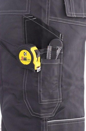 - Spodnie: 2 kieszenie przy pasie, 2 tylne kieszenie, kieszenią na narzędzia, 6 kieszeni na wysokości kolan w tym jedną boczną kieszonką na telefon komórkowy, uchwyt do przypięcia kluczy oraz uchwyt na młotek, kieszenie na nakolanniki piankowe dostępne na innych naszych aukcjach