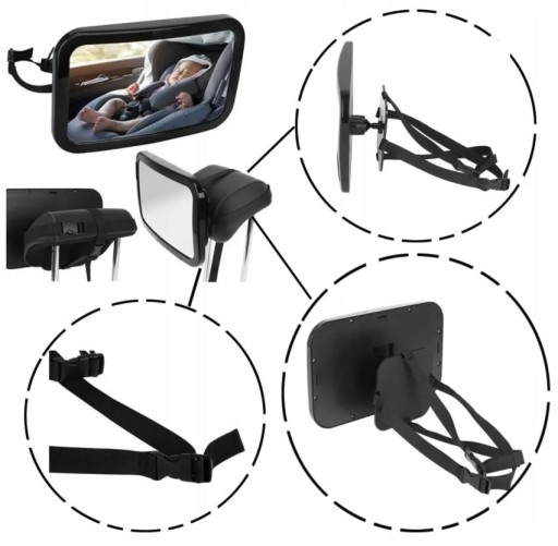 Posiada 4 paski mocowane w pionie oraz poziomie, które stabilnie trzymają się zagłówka i nie będą się luzować; nie ma możliwości, że lusterko się zsunie i spadnie na dziecko! Paski mocowane są za pomocą klamerek, dodatkowo posiadają możliwość regulacji, dzięki czemu dopasują się do każdego modelu zagłówka, niezależnie od marki oraz wielkości samochodu.