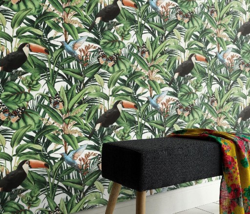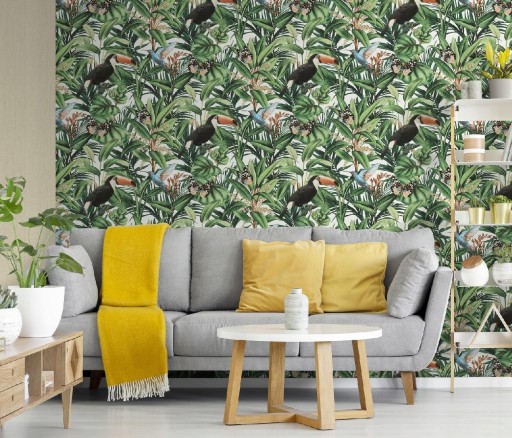 ОБОИ ДЖУНЛИ ЛИСТЬЯ ПТИЦЫ ПОПУГАИ ВИНИЛ