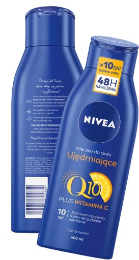 Ujędrniające mleczko do ciała NIVEA® Q10 zostało wzbogacone o dwa silne antyoksydanty - koenzym Q10 i witaminę C. Udoskonalona formuła zauważalnie ujędrnia i poprawia sprężystość skóry już po 10 dniach stosowania! Ujędrniające mleczko do ciała intensywnie nawilża skórę przez 48 godzin.
