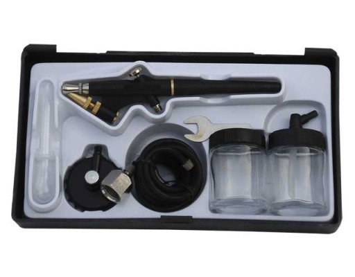 Poręczny lekki aerograf/airbrush w zestawie z zbiorniczkami, przewodem, kluczem.