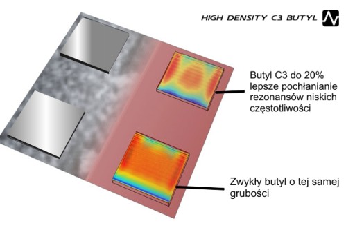 SILENT COAT GREEN to najnowsza wersja mat butylowych w naszej ofercie, oparta na bazie mieszanki C3 do produkcji, której używany jest polimer importowany z Japonii. Światowej klasy producenci z USA materiałów wygłuszających podążając za najlepszym kompromisem pomiędzy tłumienie a masą materiału zaczęli stosować najwyższej czystości zagęszczone polimery, w efekcie uzyskujemy matę o znacznie obniżonej masie ale zachowującej wysoki współczynnik stratności akustycznej. Nasze nowe produkty także podążają w tym kierunku, nowe butyle to znaczna redukcja masy nawet do 30% w stosunku do innych materiałów butylowych zawierających wypełniacze, do mieszanek butylowych stosuje się różnego rodzaju popioły wapienne oraz odpady rafinacji ropy naftowej, materiały zawierające wypełniacze wydzielają oleistą substancję, mają charakterystyczny zapach spalonego plastiku a producenci czystego butylu wskazują na substancje lotne szkodliwe dla zdrowia w mieszankach z domieszkami które nawet bo długim czasie wydzielają specyficzne zapachy.