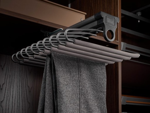 - Pełen wysuw na prowadnicy z miękkim domykiem ułatwia dostęp do spodni powieszonych na wieszaku.