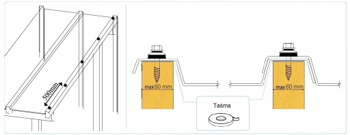 ✅Na skrajnej krokwi rozpoczynamy wiercenie otworów o średnicy 10 mm, dokręcamy panel i nakładamy kolejny postępując w ten sam sposób. Wiercenie i przykręcanie paneli zawsze rozpoczynamy od dolnej krawędzi.