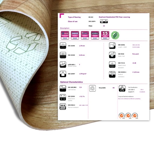 Elastyczna wykładzina o wzorze imitujący drewniane panele. Podłoga została wykonana z polyvinylchloridu znanego również pod krótszą nazwą PCV. Jest to wykładzina przeznaczona do użytku domowego. Grubości oferowanej wykładziny to 2,7 mm i warstwa użytkowa 0,2 mm, przeznaczona do pomieszczeń mieszkalnych o średnim natężeniu ruchu. Mocna - odporna na wgniecenia i załamania, oraz promienie UV.