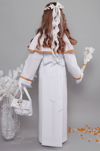 Model tej komunijnej alby ozdobiony jest na rękawach i kołnierzu obszyciem z grubszej złotej taśmy.
