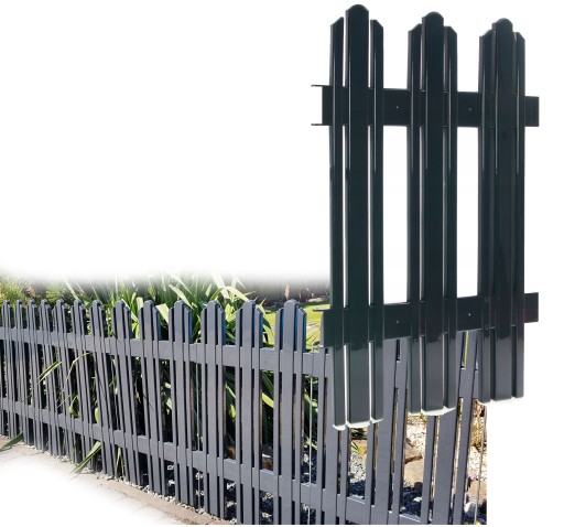 - Mocowanie poprzez przełożenie metalowej szpilki mocującej przez wypust, który tworzy zawias, pozwalający na kształtowanie przebiegu płotku, oraz jego dopasowanie do aranżacji ogrodu.