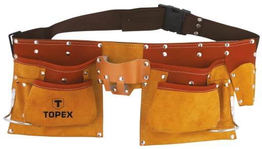 Pas monterski TOPEX (nr ref. 79R405) wykonany ze skóry. Pas posiada 11 solidnych kieszeni umożliwiających przenoszenie dużej ilości narzędzi bądź akcesoriów. Posiada płócienny pasek z możliwością regulacji obwodu, dzięki czemu łatwo dostosować go do sylwetki użytkownika. Marka TOPEX skierowana jest do majsterkowiczów.