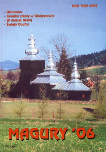 Redakcja poleca artykuł Urszuli Janickiej_Krzywdy o eremicie św. Onufrym; Tomasza Fuersta o losach murowanej cerkwi w Boguszy; Stanisława Krycińskiego o dawnym Olchowcu oraz przedruk archiwalnej kroniki szkoły w Gładyszowie z lat 1926-38. Spis treści Magur 06 Od redakcji - Stanisław Kryciński “Olchowiec” - Michał Wirchniański “Kronika szkoły w Gładyszowie” - Anna Ostrowińska “W dorzeczu Białej - część I” - Tatiana i Grzegorz Bowanko “Krótki opis nieistniejącej już wsi Żydowskie” - Adam Baniak “Uroczy to polski zakątek, owo Operne” - Paweł Stefanowski “Klimkówka” - Tomasz Ch. Fuerst “Restauracja murowanej cerkwi w Boguszy” - Urszula Janicka-Krzywda “Święty Onufry - eremita z Pustyni Tebaidzkiej” - Roman Węgrzyniak “Związki biskupa Jozafata Kocyłowskiego z jego rodzinną miejscowością - Pakoszówką” - Wojciech W. Wiśniewski “Beskid Niski i Pogórza Środkowo-Beskidzkie w życiu i twórczości Macieja Bogusza Zygmunta Stęczyńskiego (1814-1890) - Kamil Ruszała “Sprawozdanie z działalności w roku 2006 Stowarzyszenia Aktywnej Ochrony Cmentarza z I Wojny Światowej w Galicji - Tadeusz Kiełbasiński -Przegląd pozycji wydawniczych na temat Beskidu Niskiego wydanych w 2005 roku - Varia