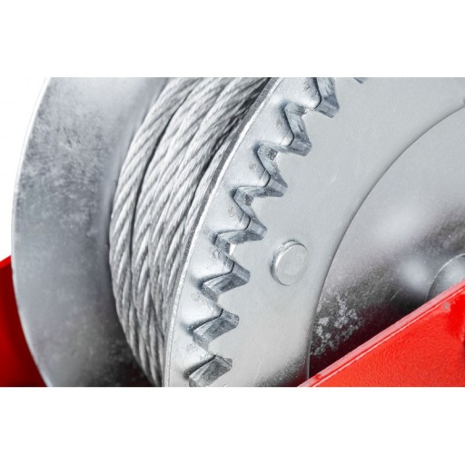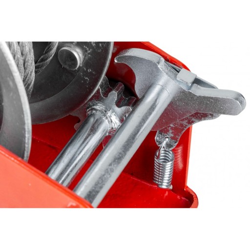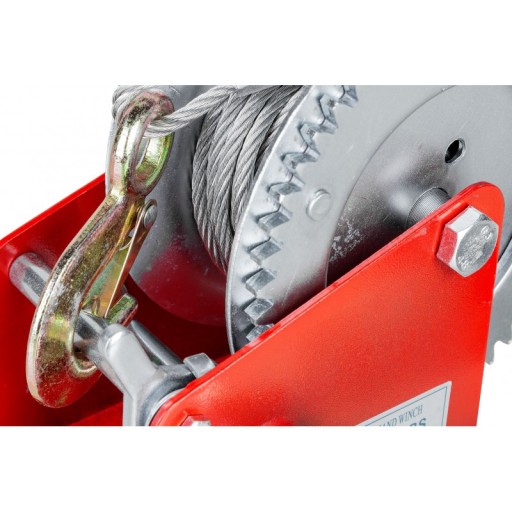 W wyciągarce zastosowano mocną i wytrzymałą linę stalową o długości 10 m, zakończoną solidnym hakiem z zabezpieczeniem przeciwko przypadkowemu wypięciu się obciążenia.