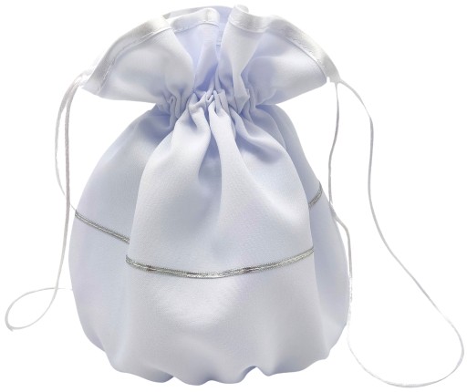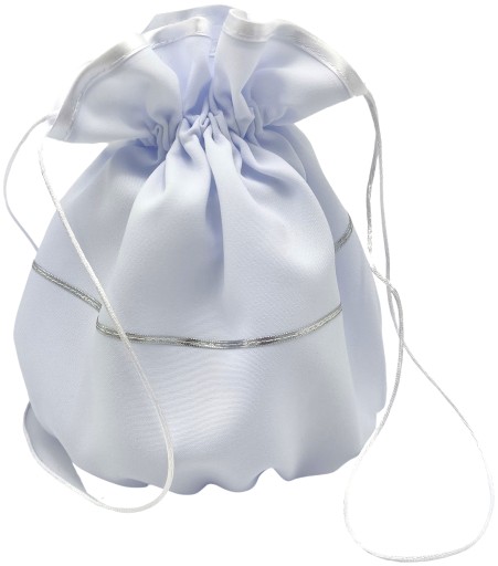Torebka stanowi efektowny dodatek do ubioru komunijnego. Ma mocno usztywnione dno, przez co zachowuje swój naturalny kształt. Uroku dodaje zdobienie srebrną taśmą liturgiczną. Woreczek jest przeznaczony do trzymania w ręku za sznureczki, które służą jednocześnie do zaciągania wlotu torebki.