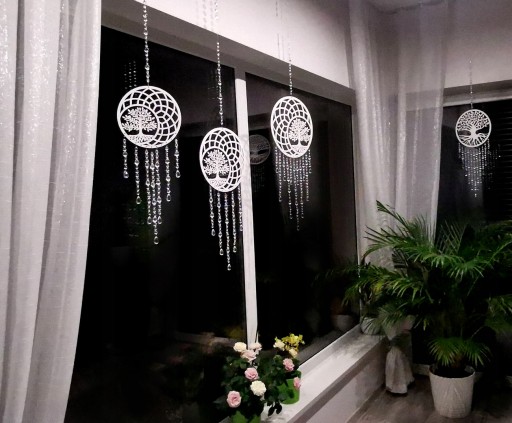Łapacz wykonany jest ze sklejki 3mm. Kolor biały, matowy. Możliwe widoczne naturalne usłojenie drewna. Wielkość drewnianej obręczy to 20 cm. Mandala ozdobiona akrylowymi kryształkami.
