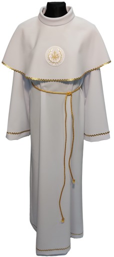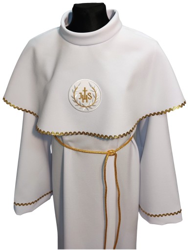 Rękawy i pelerynka obszyte są złotą pasmanterią. Do alby dołączamy dopasowany do obszyć sznur o długości 2 metrów, który podkreśla liturgiczny charakter szaty. Pod szyją delikatny golfik zapinany z tyłu na guziczek.