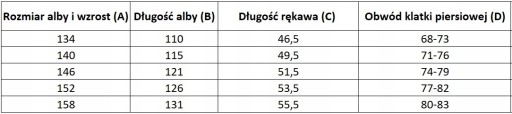 Na tej aukcji sprzedajemy albę o rozmiarze 146. Prosimy zmierzyć dziecko przed zakupem i porównać wymiary z wartościami w tabeli poniżej. Dzięki temu uzyskacie Państwo pewność, że zamówiony rozmiar będzie odpowiedni.