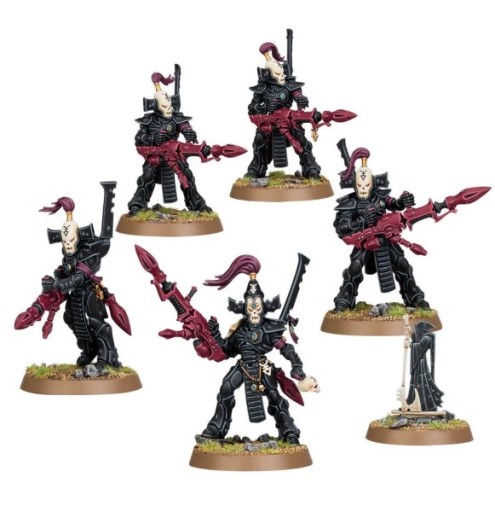 This kit builds one unit of Dark Reapers armed with reaper launchers, complete with their Exarch who can be built with a reaper launcher, shuriken cannon, aeldari missile launcher, or tempest launcher. The Exarch can be built holding a skull in their off-hand, and has a choice of four heads, while each Dark Reaper has a choice of helmeted or unhelmeted heads. Also included is a small miniature representing a Dark Reaper shrine.