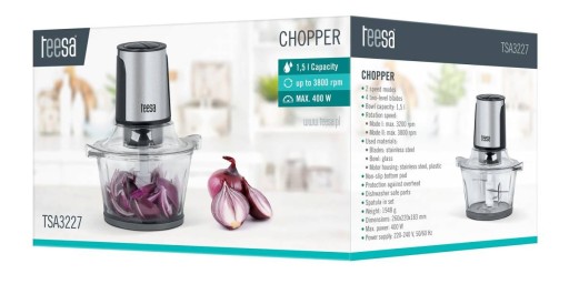 Chcesz jeszcze bardziej ułatwić sobie prace kuchenne? Przestań marnować czas na siekanie produktów zwykłym nożem – teraz zrobi to za Ciebie rozdrabniacz Teesa TSA3227! Wypróbuj go, a szybko odkryjesz, że jest on tym, czego dotychczas brakowało Ci w czasie przygotowywania obiadów czy deserów. Dzięki mocy maksymalnej 400 W oraz 2 trybom prędkości i 4 wykonanym ze stali nierdzewnej dwupoziomowym ostrzom rozdrabniaczem Teesa szybko posiekasz zarówno twarde, jak i miękkie produkty spożywcze.