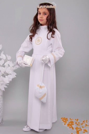 Ładna, klasyczna długa alba komunijna dla dziewczynki z prostą stójką.