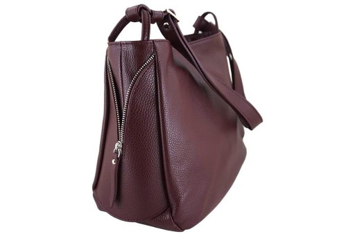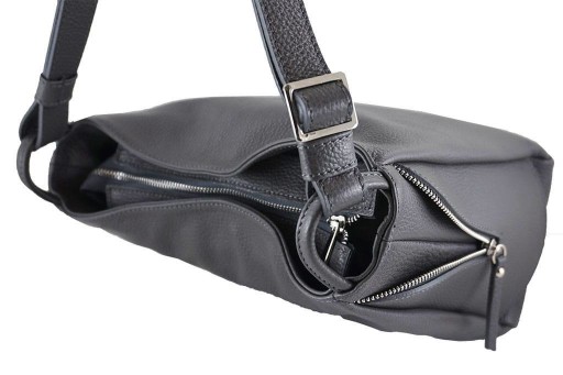 Wnętrze torebki: jednokomorowe torebki worki skórzane są wykończone podszewką. Wewnątrz znajduje się zasuwana kieszeń mieszcząca mniejsze kosmetyki lub notes oraz dwie kieszenie otwarte mieszczące telefon oraz dokumenty. Dodatkowo wyodrębniono dwie duże wewnętrzne kieszenie zapinane na zatrzask magnetyczny. Torebki worki skórzane zapinane są na suwak, posiadają długi regulowany pasek (maksymalna długość 108cm).