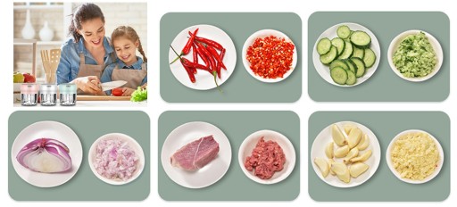 szybko posiekać: ostry nóż siekacza czosnku może szybko posiekać czosnek, przyprawy, orzechy, warzywa, mięso, kostki lodu itp. jest bardzo odpowiedni dla małych produktów spożywczych. Można go używać do gotowania, suplement diety dla dzieci, napoje smoothie.