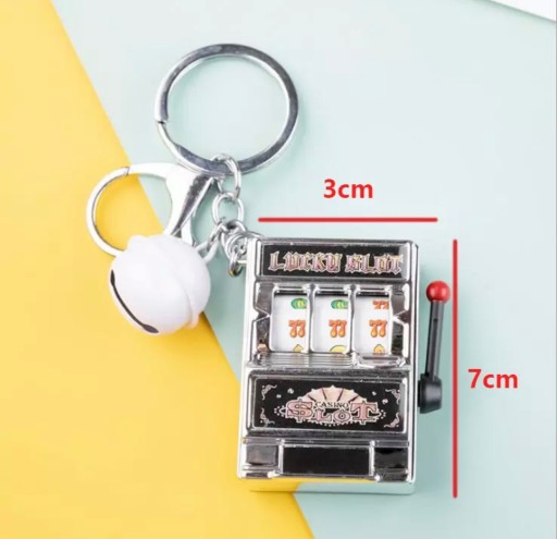 Super zabawny beloczek dla wszystkich wielbicieli gier w kasynach i maszyn o niewielkich wygranych. Brelok przedstawia małą maszynę jednorękiego bandyty. Teraz w każdej chwili można siegnąć do kieszeni, pociągnąć za dźwignię i cieszyć się z ewentualnej wygranej. Brelok na metalowym łańcuszku.