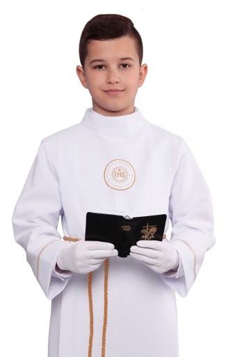 Alba jest delikatnie ozdobiona na rękawach biało-złotą tasiemką z motywem jodełki.