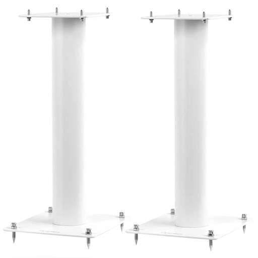 Para wysokiej jakości stojaków dedykowanych do podstawkowych kolumn głośnikowych, wyposażonych w zintegrowany kanał do przeprowadzenia przewodów oraz podstawy z regulowanymi kolcami.