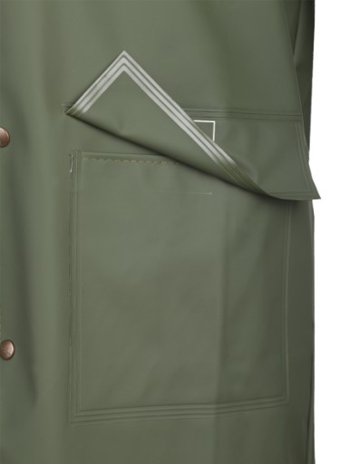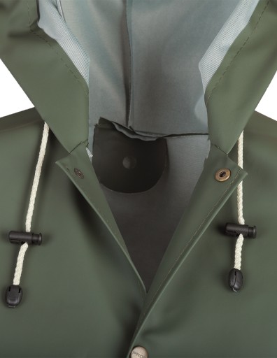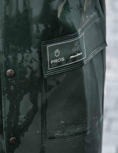 Płaszcz zapinany na napy, z kapturem i dwiema bocznymi kieszeniami przykrytymi patkami. Model produkowany z wodoochronnej tkaniny Plavitex, przeznaczony do użytku w niesprzyjających warunkach pogodowych. Zapewnia skuteczną ochronę przed wiatrem i deszczem. Technika obustronnego zgrzewania zwiększa wytrzymałość szwów. Produkt spełnia standardy europejskich norm: EN ISO 13688 i EN 343.