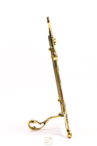 Ramka odlana z mosiądzu, utrzymana w połysku, z delikatną patyną w zakamarkach. Całość pokryta lakierem zapobiegającym utlenianiu się mosiądzu. Ramka do postawienia, z tyłu znajduje się rozkładana nóżka, którą najlepiej dokręcić, żeby zapobiec ewentualnej wywrotce. Zdjęcie wkładamy od tyłu, w tym celu należy zwolnić 4 śrubki, przesunąć skoble, włożyć zdjęcie razem z podkładem, dokręcić śrubki i gotowe. Produkt polski — wspieramy polskie rzemiosło.