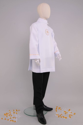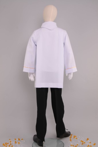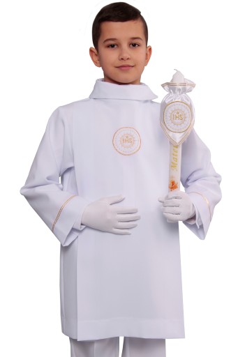 Krótka alba komunijna dla chłopca z wykładanym kołnierzykiem przechodzącym z tyłu w kształt rożka.