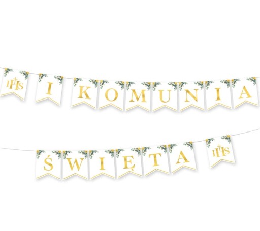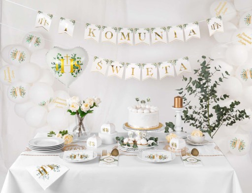 Biel i złoto to podstawowe kolory, które są nieodłącznym elementem Pierwszej Komunii Świętej, tak więc nasze ozdoby będą pasować idealnie do wystroju, dodatkowo uzupełnione zostały o piękny motyw z eukaliptusem, modny i efektowny.