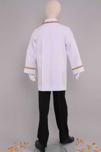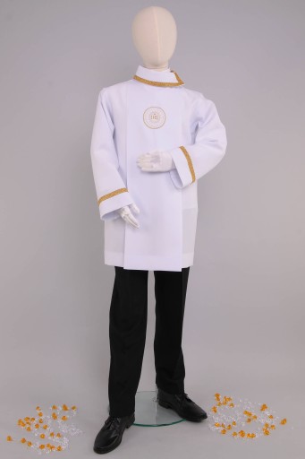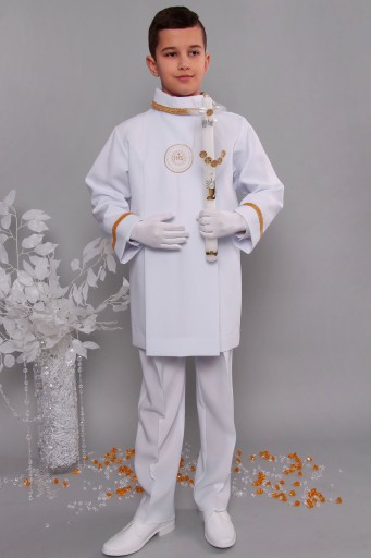 Krótka alba komunijna dla chłopca z wykładanym kołnierzykiem przechodzącym z tyłu w kształt rożka.